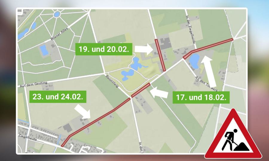 Die Arbeiten im Bereich der Straßen Am Ziegelofen und In der Ziegelheide starten am Dienstag, den 17. Februar. Im Rahmen der regelmäßigen Baumkontrollen wurde bei insgesamt zehn Roteichen eine deutliche Schwächung durch eine Pilzerkrankung festgestellt. Eingehende Untersuchungen mittels Bohrwiderstandsmessungen bestätigten, dass die verbliebene Restwandstärke der Stämme keine ausreichende statische Funktion mehr erfüllt.