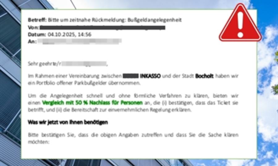 Aktuell mehren sich in Bocholt die Fälle von Betrugsversuchen im Zusammenhang mit vermeintlichen Schreiben oder E-Mails der Stadtverwaltung. Bürgerinnen und Bürger erhalten derzeit Schreiben, in denen fälschlicherweise behauptet wird, die Stadt Bocholt habe ein Inkassounternehmen mit der Eintreibung von Forderungen beauftragt.