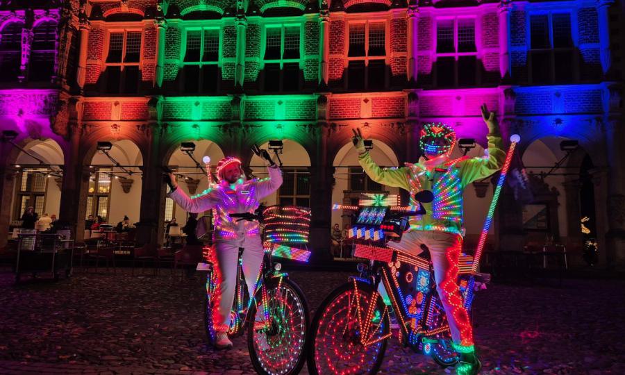 Ein besonderes Highlight vor dem Historischen Rathaus war die Feuershow von Künstler Lemmi, der am Nachmittag mit spektakulären Effekten begeisterte und am Abend mit einer farbenprächtigen Lichtershow auf dem vollen Marktplatz noch einmal nachlegte.ÂUnd zur Dunkelheit gab es noch eine Überraschung: die „Easy Night Rider“ mit ihren leuchtenden Fahrrädern kamen extra aus Hamm angereist und beeindruckten farbenfroh die Passanten in den Citystraßen. Es bildeten sich Menschentrauben ob des leuchtenden Lichtes von Rädern und Fahrer bzw. Fahrerin. „Und immer die Marke im Blick,“ verwies Stadtmarketing Geschäftsführer Ludger Dieckhues auf das Fahrrad als eines der Markenzeichen von Bocholt. „Unser Markenzeichen nun auch illuminiert beim Lichtersonntag!“