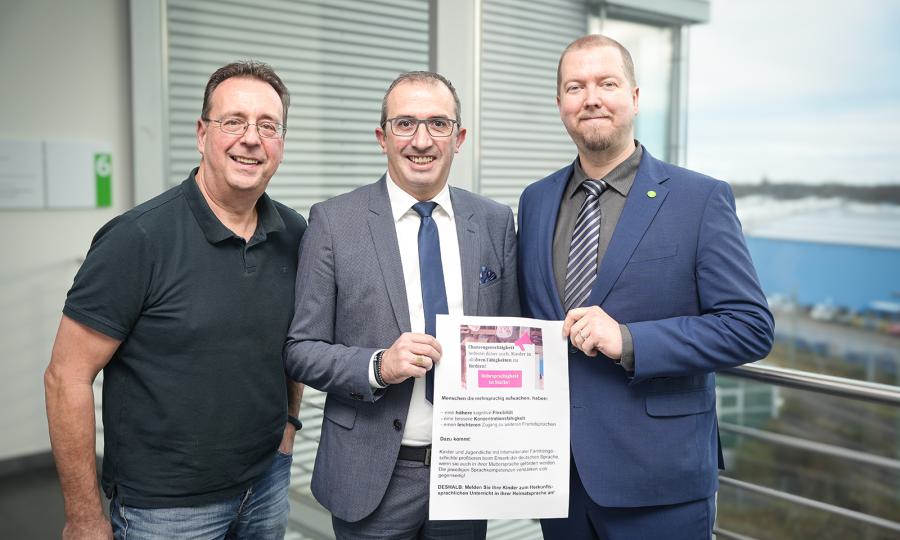 Setzen sich für den Herkunftssprachlichen Unterricht (HSU) ein (v.r.n.l.): Erster Stadtrat Björn Volmering, Juan Lopez Casanava, Vorsitzender des Ausschusses für Chancengerechtigkeit und Integration und Bruno Wansing, Integrationsbeauftragter der Stadt Bocholt - Foto: Tobias Rodig, PID