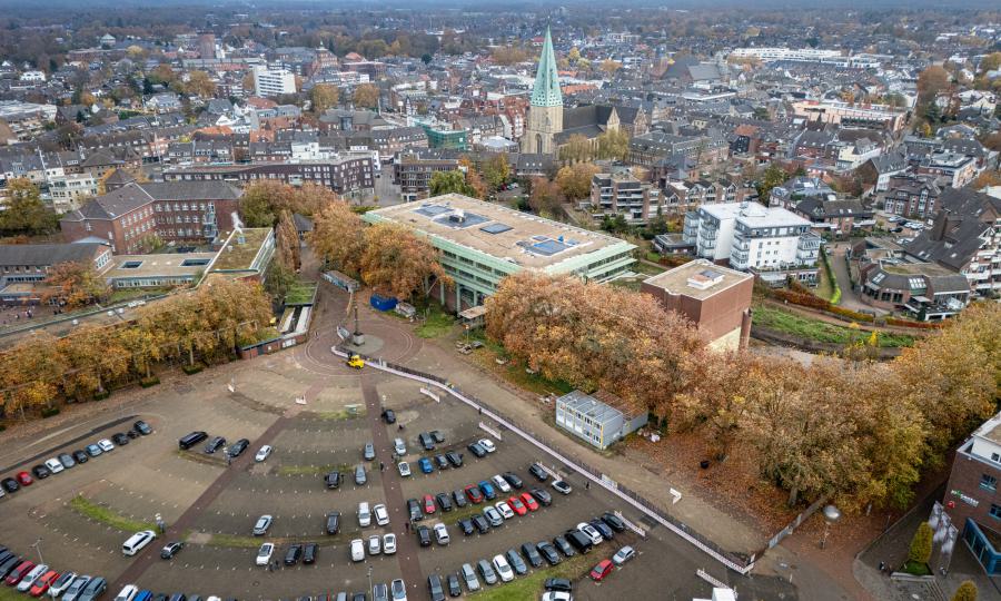 Im Zuge der Sanierungsmaßnahmen am Rathaus und Theater werden Mitte Januar die nächsten Bauphasen eingeleitet, die mit sichtbaren Veränderungen im Baustellenbereich einhergehen. Ein weithin erkennbarer Bestandteil ist dabei die Montage eines großen Turmdrehkrans, der unter anderem für die anstehenden weiteren Arbeiten im Bereich der Hinterbühne, für die Einbringung des Schotters in die Aa und die in Kürze beginnenden Dachdeckerarbeiten benötigt wird. Da die Anlieferung der Kranelemente mit mehreren Schwertransportern erfolgt, wird die gesamte Fläche des Berliner Platzes am 15. Januar  für die Logistik und das Rangieren der Fahrzeuge sowie für die Montage des 60 Meter langen Kranauslegers benötigt. Bürgerinnen und Bürger sowie alle Verkehrsteilnehmenden werden gebeten, am Donnerstag auf umliegende Parkmöglichkeiten auszuweichen.