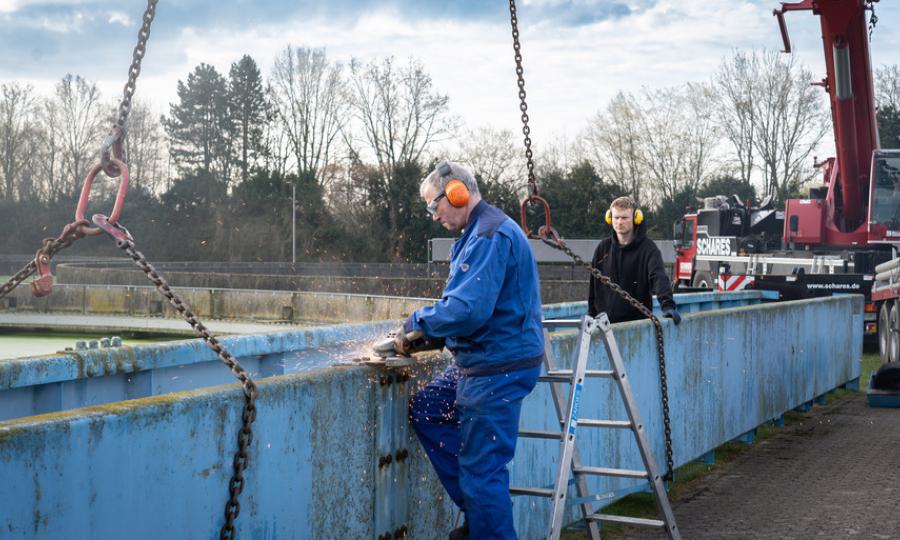 Im Klärwerk der Stadt Bocholt an der Brömmelingstiege wurde heute eine 28 Meter lange Räumerbrücke für umfassende Sanierungsmaßnahmen ausgebaut. Die Anlage wird nun grundlegend instand gesetzt, um die langfristige Betriebssicherheit des Nachklärbeckens 3 zu gewährleisten.