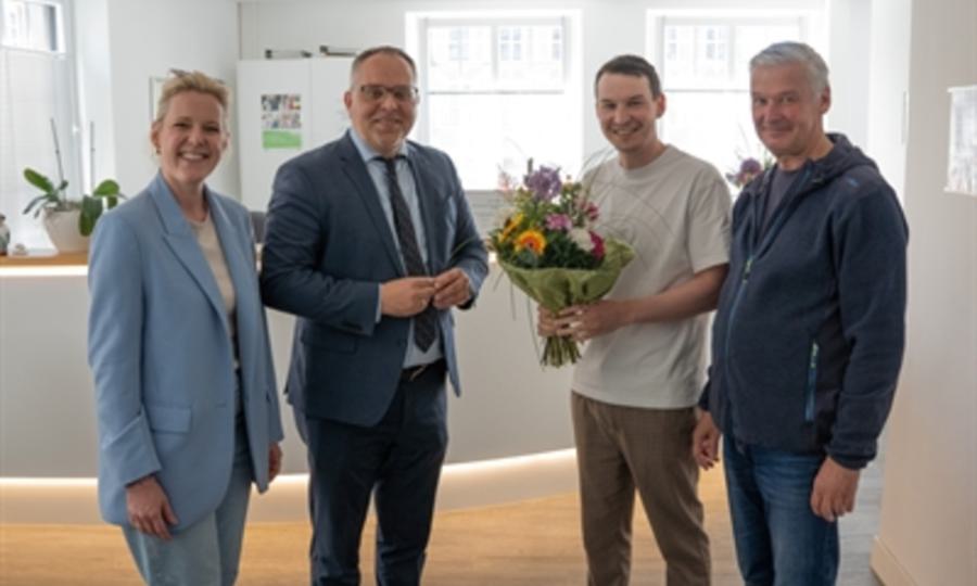 Gemeinsam mit Bürgermeister Thomas Kerkhoff begrüßt Lisa Knuf den Mediziner Timo Sigmund (2. von rechts), der die Praxis künftig mit seinem Vater Dr. med. Björn Sigmund führen wird. (Copyright: Stadt Bocholt)