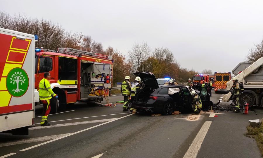 Bei Eintreffen der Feuerwehr stellte sich heraus, dass sich ein Verkehrsunfall zwischen einem PKW und einem LKW ereignet hat. Insgesamt gab es drei verletzte Personen. Zwei leichtverletzte Personen, darunter der Fahrer des LKW wie auch der Beifahrer des PKW wurden durch die Feuerwehr erstversorgt. Eine schwerverletzte Person befand sich eingeklemmt auf dem Fahrersitz des PKW. Die Feuerwehr befreite diese mit technischem Gerät und übergab alle verletzten Personen zur medizinischen Versorgung dem Rettungsdienst. Lebensgefahr bestand nicht. Außerdem hat die Feuerwehr noch die ausgelaufenen Betriebsmittel gegen weiteres auslaufen abgeschirmt. Die Polizei sperrte die komplette Fahrbahn während der gesamten Einsatzmaßnahmen.