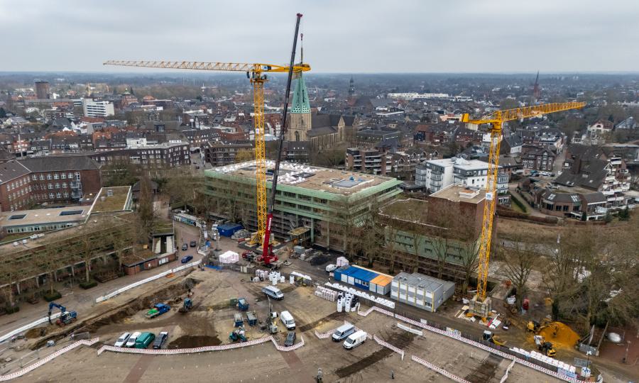 Auf der Baustelle am Rathaus wurde in dieser Woche der zweite Turmdrehkran erfolgreich errichtet und in Betrieb genommen. Mit einer Höhe von über 50 Metern ist er rund zehn Meter höher als der bereits vorhandene Kran. Die Montage markiert einen wichtigen Schritt für die weiteren Arbeiten am Gebäude und die logistische Erschließung des Berliner Platzes.
