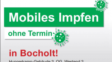 Donnerstag, November 4, 2021 - 09:59An drei Terminen können sich Bürgerinnen und Bürger im November vor Ort in Bocholt, im Hungerkampgebäude am Westend 2, gegen Corona impfen lassen.