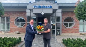 Theodor Elsweier, Gewinnsparer bei der Volksbank Bocholt eG, hat allen Grund zum Strahlen: Für die kommenden fünf Jahre erhält er ein monatliches Extra-Geld in Höhe von 250 Euro. Kundenberater Tim Mäteling überbrachte die freudige Nachricht an den Extra-Geld-Gewinner.
