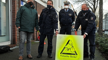 Freitag, Dezember 18, 2020 - 11:13"Falsche Seite" steht unter dem symbolisierten Fahrradfahrer mit dem angedeuteten Warndreieck, den Volker Meerkötter und Andreas Rudde am Mittwoch per Schablone auf den Radweg a