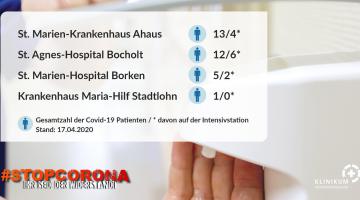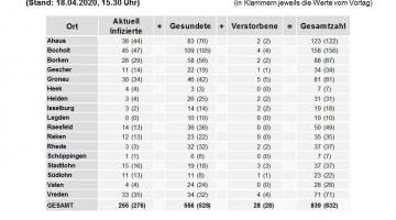 Die Gesamtzahl der bestätigten Infektionen mit dem Coronavirus im Kreis Borken liegt aktuell (18.04.2020, 15.30 Uhr) bei 839 (gestern 832).