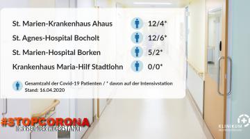 Donnerstag, April 16, 2020 - 19:11Die Anzahl an stationären Covid-19 Patienten im Klinikum Westmünsterland ist heute auf 29 gesunken. 12 Patienten hiervon werden auf der Intensivstation behandelt.