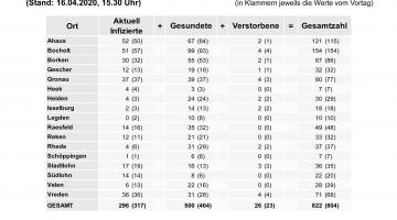 Donnerstag, April 16, 2020 - 16:54Im Kreis Borken gibt es aktuell (16.04.2020, 15.30 Uhr) 822 (gestern 804) bestätigte Coronavirus-Infektionen. 500 Personen (gestern 464) sind inzwischen gesundet.