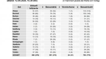 Sonntag, April 12, 2020 - 21:09Die Gesamtzahl der bestätigten Infektionen mit dem Coronavirus bei uns im Kreis Borken liegt aktuell (12.04.2020, 15.30 Uhr) bei 783 (gestern 770).