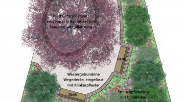 Kleine Natur-Oase in der City // Sitzbänke, Beete und Sträucher rund um Buche