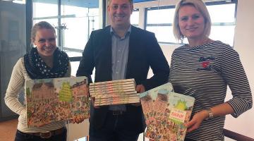 Dienstag, Oktober 9, 2018 - 17:09Vor dem Historischen Rathaus ist viel los: Ein Pärchen heiratet, vom Fenster regnen Blumen herab. Gleichzeitig verliert ein Junge im Kinderwagen am Gemüsestand seinen Schnuller, was dem Rosenverkäufer, der sich gerade bückt, auffällt. Ein verliebtes Pärchen schleckt derweil Rücken an Rücken genussvoll ein Eis, während über Bocholt ein Heißluftballon mit dem Stadtwappen schwebt.