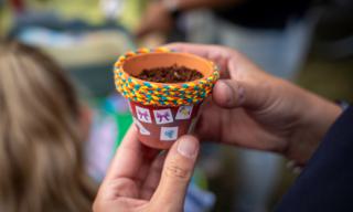 Bild: Mit einem Hubsteiger befestigen die Arbeiter die Stoffbahnen am Gebäude (Copyright: Stadt Bocholt)